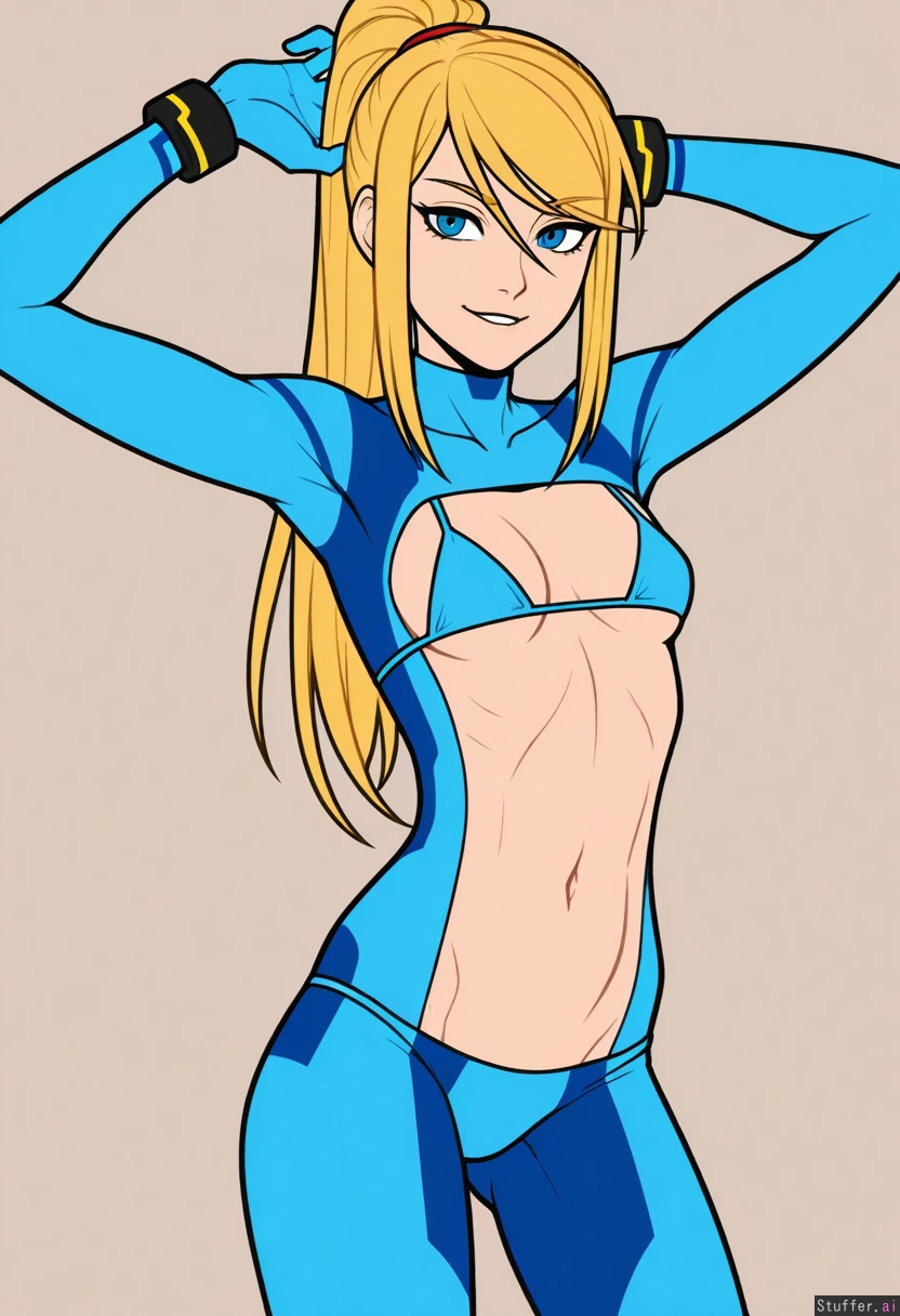 (Kinkymation(artist):0.5), (pudgeruffian(artist):0.3), Beige background, 1woman, milf, solo, (simple style), ((less detail)), ((flat colors)), (((zero suit samus))), blonde hair, round eyes, blue eyes, eye liner, cute face, looking at viewer, smiling, light skin, biting lip, posing, arms raised, ((slim:1.5)), toned belly, (Athletic build), fit figure, ((skinny)), midriff (Blue micro bikini) Modest boobs, ((eyes open)),