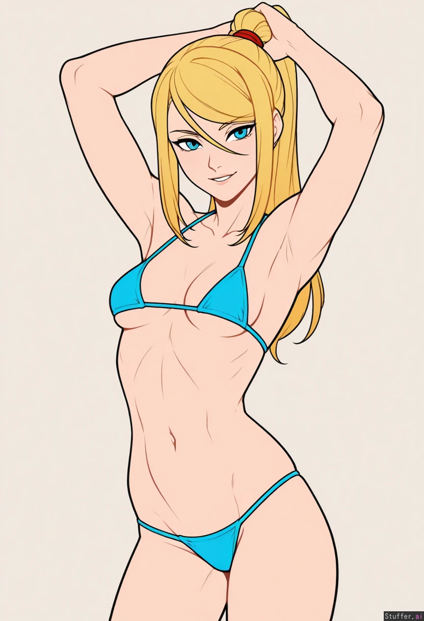 (Kinkymation(artist):0.5), (pudgeruffian(artist):0.3), Beige background, 1woman, milf, solo, (simple style), ((less detail)), ((flat colors)), (((samus))), blonde hair, round eyes, blue eyes, eye liner, cute face, looking at viewer, smiling, light skin, biting lip, posing, arms raised, ((slim:1.5)), toned belly, (Athletic build), fit figure, ((skinny)), midriff (Blue micro bikini) Modest boobs, ((eyes open)),