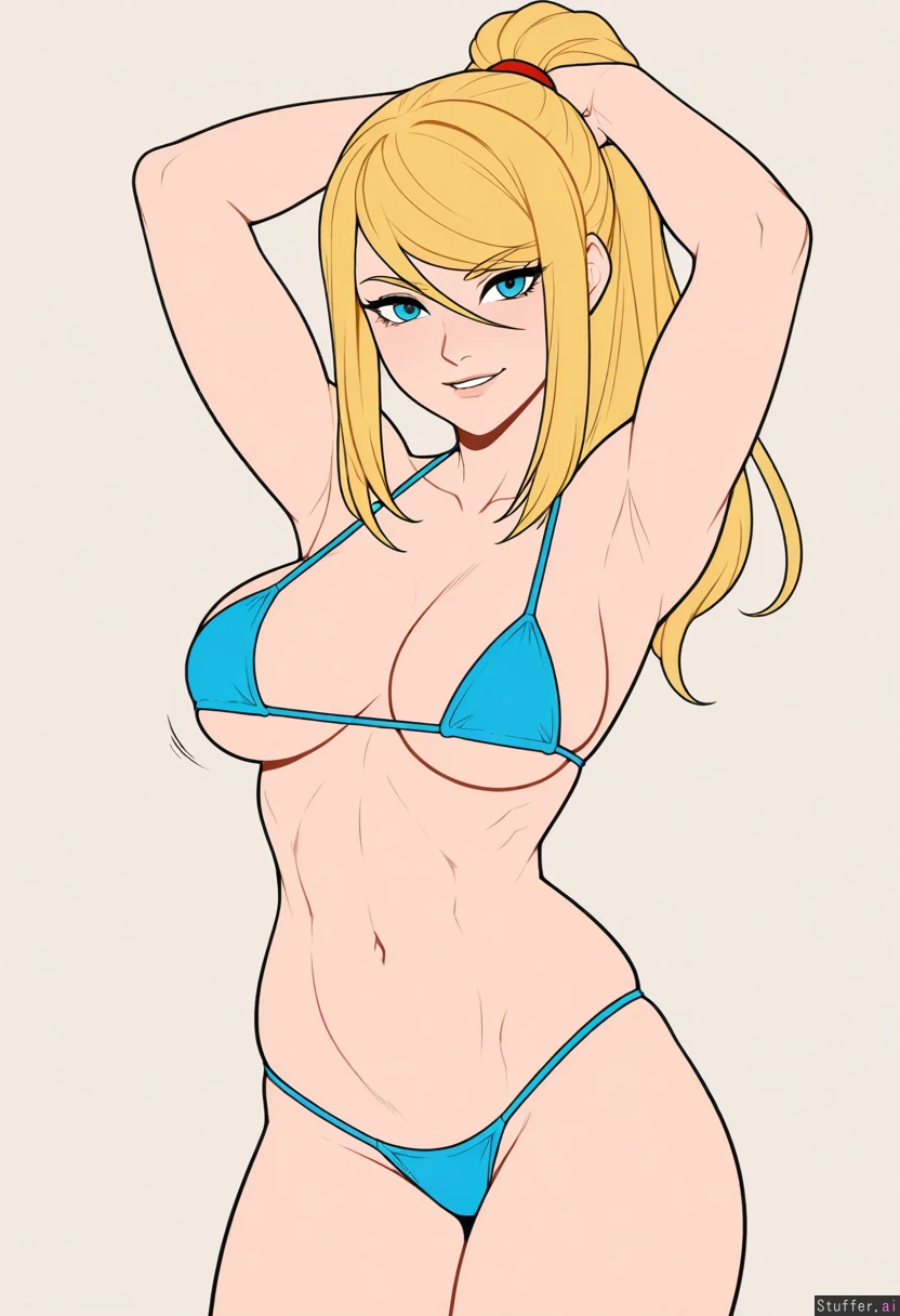 (Kinkymation(artist):0.5), (pudgeruffian(artist):0.3), Beige background, 1woman, milf, solo, (simple style), ((less detail)), ((flat colors)), (((samus))), blonde hair, round eyes, blue eyes, eye liner, cute face, looking at viewer, smiling, light skin, biting lip, posing, arms raised, ((slim:1.2)), toned belly, (Athletic build), fit figure, ((skinny)), midriff (Blue micro bikini), Modest boobs, breast expansion, top heavy, ((eyes open)), Wide hips,