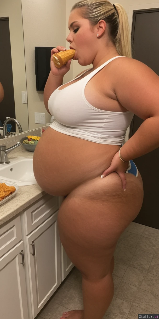 21 years old, (((voluptuous and curvy fat body))), bbw, blob, light long blonde hair, massive hips, ((massive thick fat thighs:1.8)), ((gigantic ass:1.9)), ((huge enormous realistic big bloated massive tan soft swollen belly overflowing on sink and hanging down:1.9)), curvy, (Caucasian skin:1.5), green eyes, (big lips), ((huge large tan cleavage:1.7)), ((gigantic wide hips:1.3)), ((super tight curve fitting long large white Tank shirt, outgrown shorts, fully clothed:1.9)), wearing jewelry, super wealthy, gold necklace, ((fully clothed, standing in front of bathroom mirror selfie, surrounded by snacks and trays of foods, eating fried fast food and cakes stuffing her face with food:1.5)), lazy, ((view from side angle, view from above:1.8)), ((beautiful luxurious rich expensive influencer like face model:1.5)), ((big soft fat chubby arms:1.7)), ((white toenails:1.4)), ((super realistic)), candid