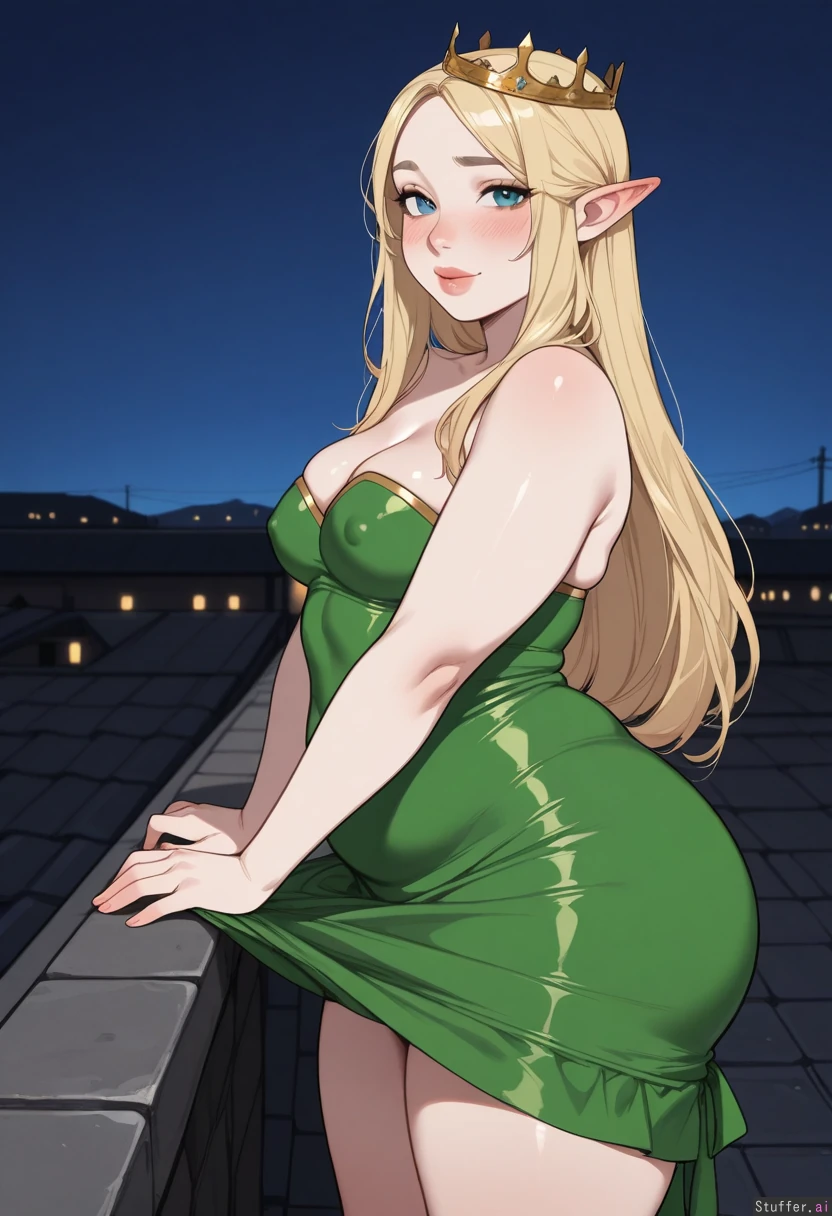 Solo, girl, KAMII MOMORU(artist), ((elf, pale skin, beautiful face, cute face, long blonde hair)), horny, ((tight Strapless green dress, wearing a crown)), ((alt girl, plump lips)), 8655small_breasts, ((thick, fat_rolls:0.0, belly_expansion:0)), (blushing face), (sexy pose, sexy), thick thighs, shy, standing, on roof, night, 7544flatchest, erect nipples under clothing, side view, Dramatic lighting, ((looking at viewer))