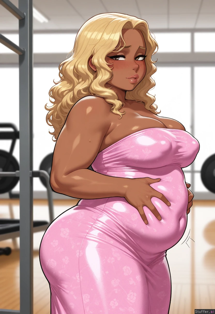 Solo, Krekkov(artist),((1girl, blonde wavy hair, dark skin, short Strapless Floral pink dress)), horny, ((tight clothes)), (( plump lips)), ((thick, chubby:0.0)), (blushing face), (sexy pose, sexy), shy, at a gym, day, 1966small_breasts, side view, standing, puffy nipples, (tits_overflowing_dress:1.7), Dramatic lighting, (Weight gain:0.0), (chubby_arms:0.00), (fat_legs:0.00), (belly rolls:0.0) ((looking at viewer)) grabbing_own_belly, hands_on_belly