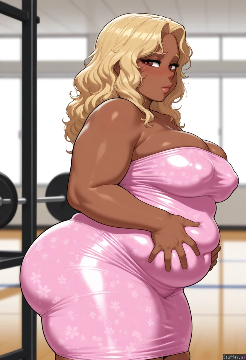 Solo, Krekkov(artist),((1girl, blonde wavy hair, dark skin, short Strapless Floral pink dress)), horny, ((tight clothes)), (( plump lips)), ((thick, chubby:0.0)), (blushing face), (sexy pose, sexy), shy, at a gym, day, 1966small_breasts, side view, standing, puffy nipples, (tits_overflowing_dress:1.7), Dramatic lighting, (Weight gain:0.0), (chubby_arms:1.32), (fat_legs:0.99), (belly rolls:1.23) ((looking at viewer)) grabbing_own_belly, hands_on_belly