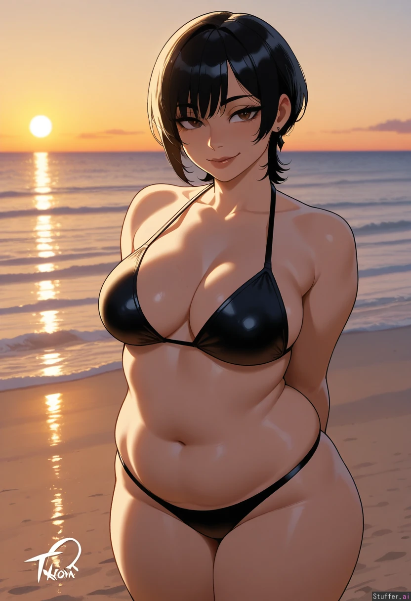 solo, masterpiece, amazing resolution, nyantcha(artist), krekkov(artist), dramatic lighting, intricate details, detailed eyes, hdr, best quality, (soft shading), dim lighting, realistic lighting, standing in sand, teasing (tilting head sideways, hands behind back), looking at viewer, 1woman, ((chubby alt mommy)), long wolf cut curly shaggy_hair, brown eyes, flirty, black hair with black highlights, her bangs are black, wide hips, thick thighs, medium breasts, (thin belly:1.2), tummy pooch, legs crossed, relaxed, sweet, nave, flushed, ((fit:1.6)), slim figure, fatass, large protruding belly, thin arms, Black diamond triangular earrings, black bikini top, black bikini bottom, Beach, outside, sunset