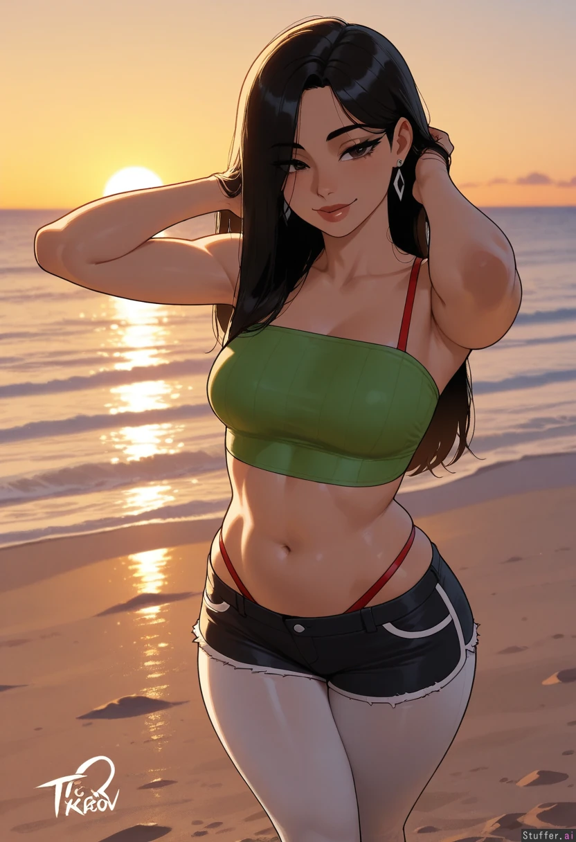 solo, masterpiece, amazing resolution, nyantcha(artist), krekkov(artist), dramatic lighting, intricate details, detailed eyes, hdr, best quality, (soft shading), dim lighting, realistic lighting, standing in sand, teasing (tilting head sideways, hands playing with hair), looking at viewer, 1woman, ((alt mommy)), long cut shaggy_hair, dark brown eyes, flirty, black hair with black highlights, her bangs are black, wide hips, thick thighs, medium breasts, (skinny belly:1.2), tummy pooch, legs crossed, relaxed, sweet, nave, flushed, ((fit:1.6)), slim figure, fatass, thin arms, Black diamond triangular earrings, red bikini straps, lime green baggy tube top, black bikini bottom straps, black ripped Jean shorts, white thigh-high leggings, Beach, outside, sunset
