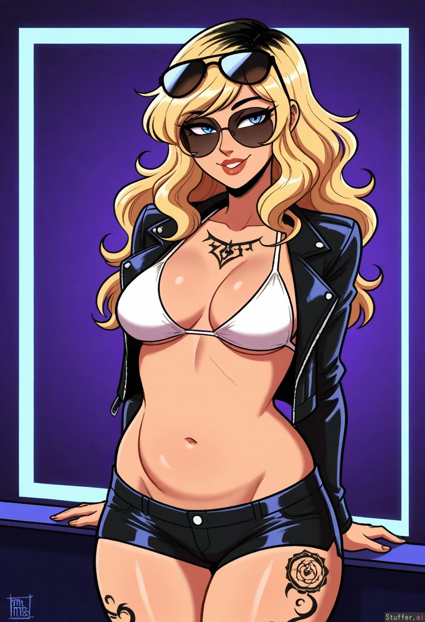 Solo, scruffyturtles(artist), perfect proportions, (supermodel face), sexy, ((realistic, detailed)), ((latina)) (Dyed blonde hair), ((black roots)) wavy hair ((blue eyes)), black eye liner, (black leather jacket), (white bikini top), (aviator sunglasses), (black shorts), (((tattoos))), (light tan skin) ((Soft body)), (medium breasts), ((soft hips)), ((soft thighs)), (curvy belly), (potbelly) (In a nightclub bar), standing, (flirty smile), sexy pose, big lips, hands on bar