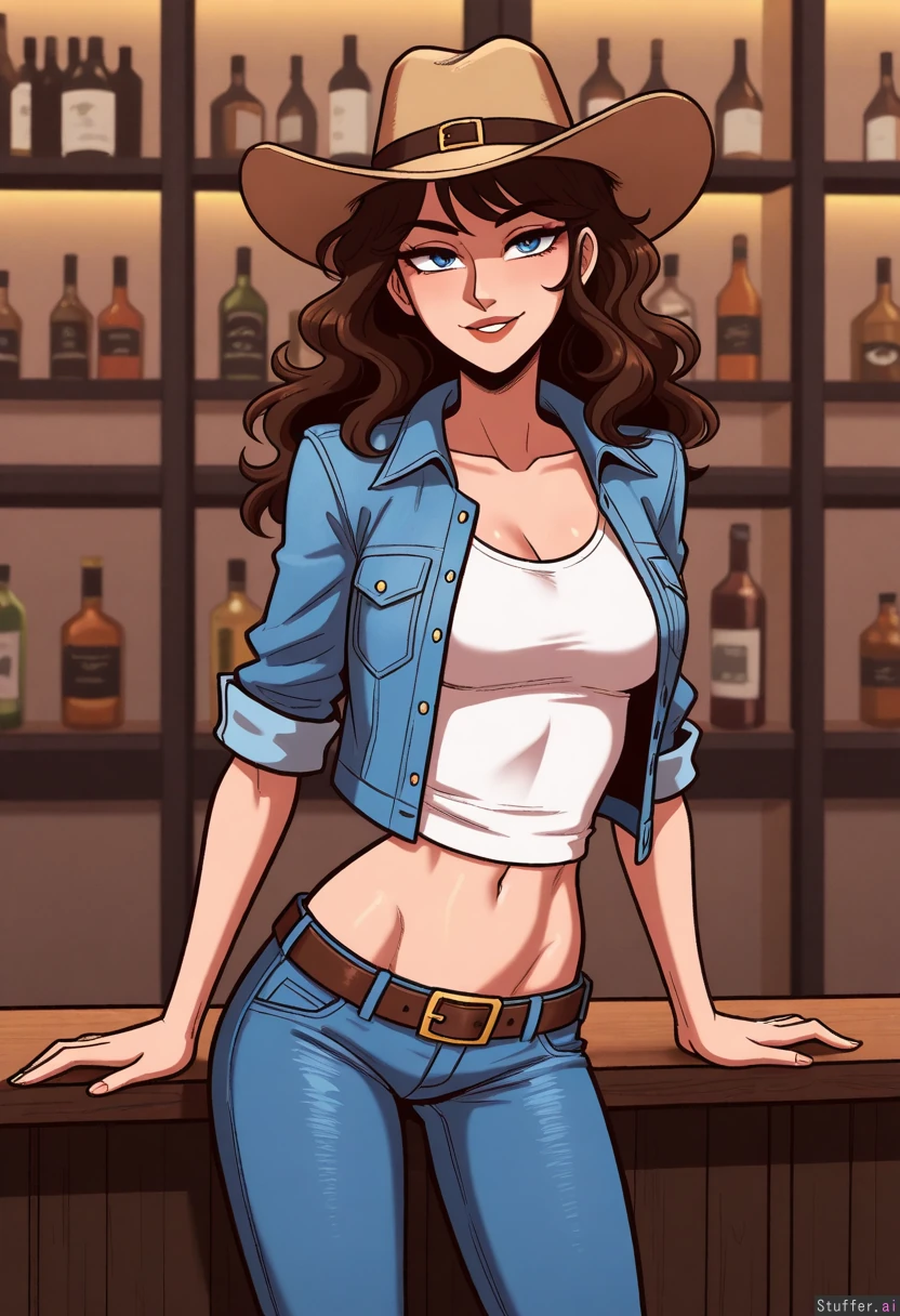 Solo, scruffyturtles(artist), perfect proportions, (supermodel face), sexy, ((realistic, detailed)) (Dark brown hair), wavy hair ((blue eyes)), black eye liner, (white tank top), (jeans), (denim jacket), (((fully clothed))), (brown belt), beige cowboy hat (((Skinny body))), (medium breasts), ((skinny hips)), ((skinny thighs)) (In a bar), standing, (flirty smile), sexy pose, big lips, hands on bar