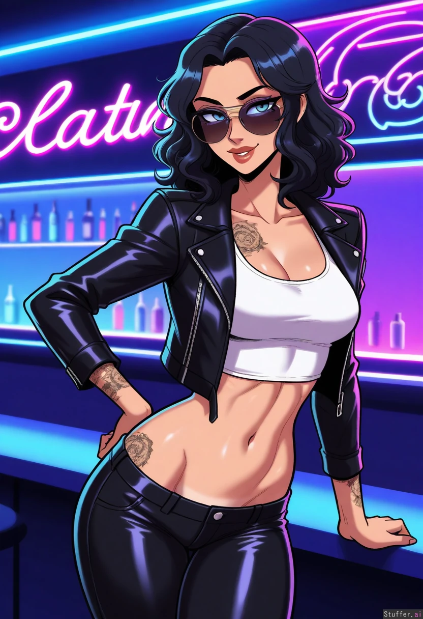 Solo, scruffyturtles(artist), perfect proportions, (supermodel face), sexy, ((realistic, detailed)), ((latina)) (Black hair hair), wavy hair ((blue eyes)), black eye liner, (black leather jacket), (white tank top crop top), (aviator sunglasses), (black jeans), (((tattoos))), (light tan skin) (((Skinny body))), (medium breasts), ((skinny hips)), ((skinny thighs)) (In a nightclub bar), standing, (flirty smile), sexy pose, big lips