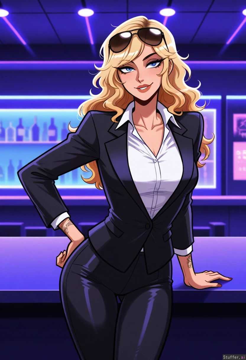 Solo, scruffyturtles(artist), perfect proportions, (supermodel face), sexy, ((realistic, detailed)), ((latina)) (Dyed blonde hair), ((black roots)) wavy hair ((blue eyes)), black eye liner, (black suit jacket), (white button down shirt), (black dress pants), tattoos, (light tan skin), ((((fully clothed)))), (aviator sunglasses on head) (((Skinny body))), (medium breasts), ((skinny hips)), ((skinny thighs)) (In a nightclub bar), standing, (flirty smile), sexy pose, big lips, (hands on bar)