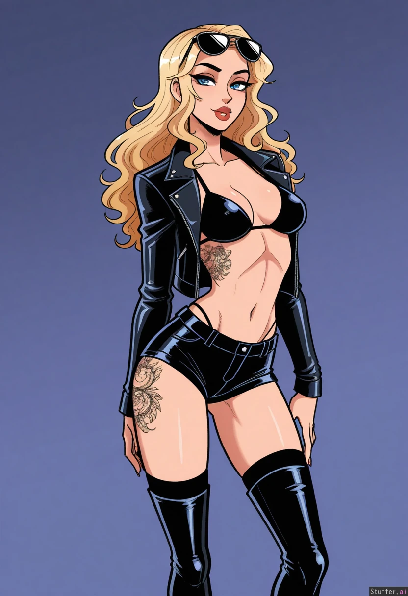 Solo, scruffyturtles(artist), perfect proportions, (supermodel face), sexy, ((realistic, detailed)), ((latina)) (Dyed blonde hair hair), ((black roots)), long wavy hair, blue eyes, black eye liner, (((tattoos))), (light tan skin), aviator sunglasses, (black bikini top), (black shorts), (black thighhigh boots), *black leather jacket) (((Skinny body))), (medium breasts), ((skinny hips)), ((skinny thighs)) (At a nightclub), standing, (flirty smile), sexy pose, big lips