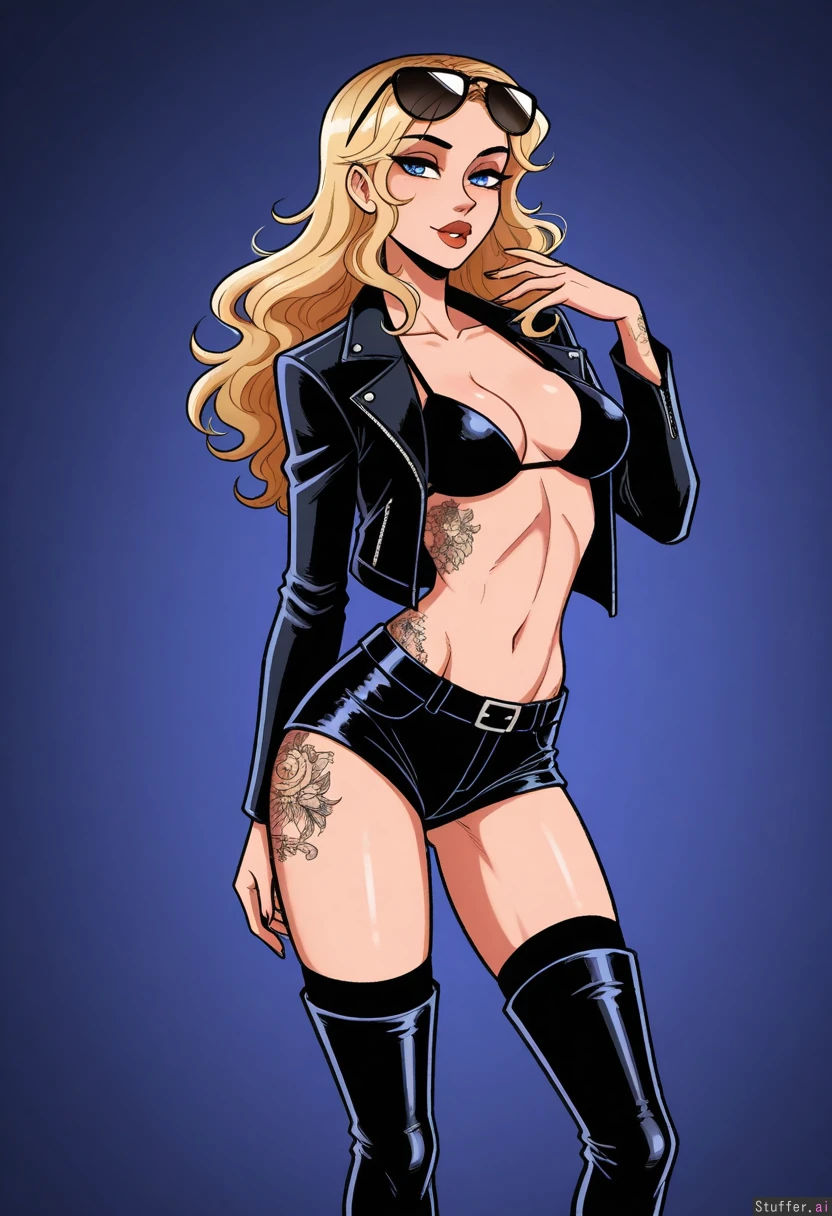 Solo, scruffyturtles(artist), perfect proportions, (supermodel face), sexy, ((realistic, detailed)), ((latina)) (Dyed blonde hair hair), ((black roots)), long wavy hair, blue eyes, black eye liner, (((tattoos))), (light tan skin), aviator sunglasses, (black bikini top), (black shorts), (black thighhigh boots), *black leather jacket) (((Skinny body))), (medium breasts), ((skinny hips)), ((skinny thighs)) ((Standing in a nightclub)), standing, (flirty smile), sexy pose, big lips