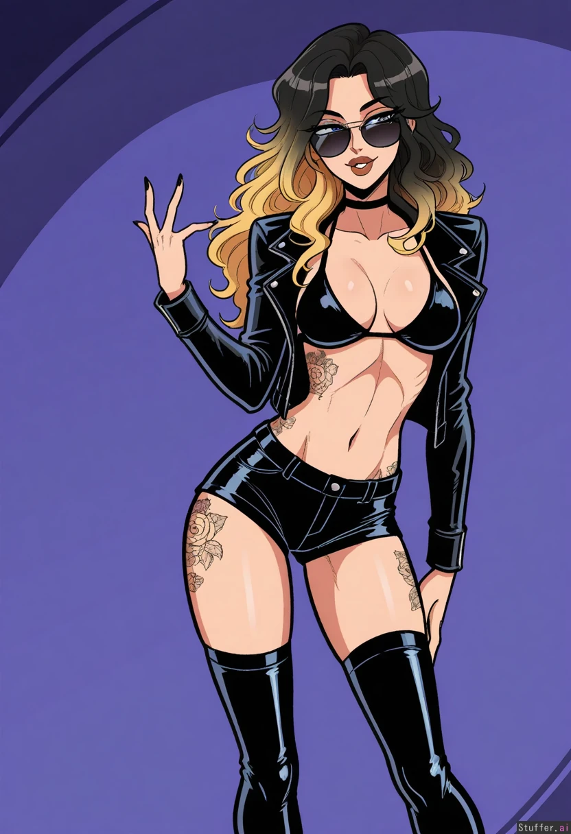 Solo, scruffyturtles(artist), perfect proportions, (supermodel face), sexy, ((realistic, detailed)), ((latina)) (Dyed blonde hair hair), ((black hair roots)), long wavy hair, blue eyes, black eye liner, (((tattoos))), (light tan skin), aviator sunglasses, (black bikini top), (black shorts), (black thighhigh boots), *black leather jacket) (((Skinny body))), (medium breasts), ((skinny hips)), ((skinny thighs)) (Standing in a nightclub), standing, (flirty smile), (sexy pose), big lips