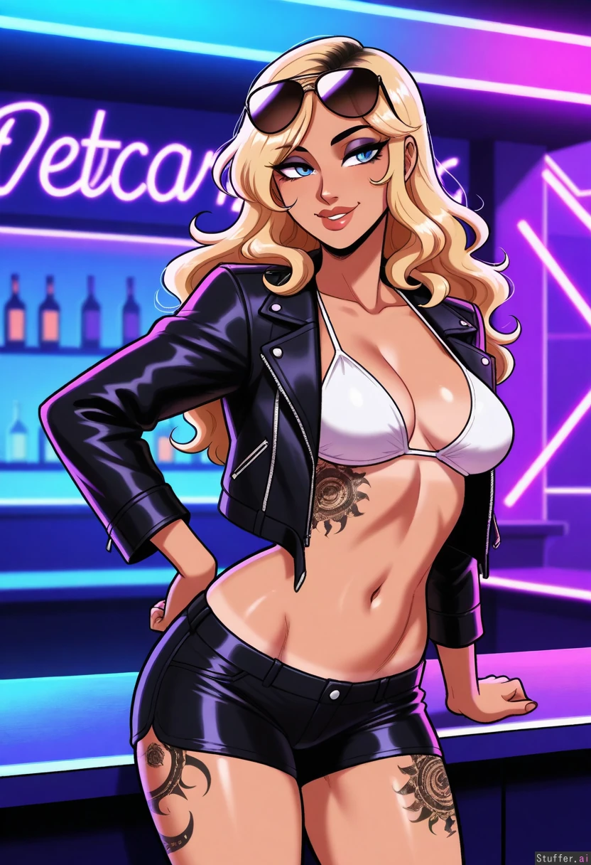 Solo, scruffyturtles(artist), perfect proportions, (supermodel face), sexy, ((realistic, detailed)), ((latina)) (Dyed blonde hair), ((black roots)) wavy hair ((blue eyes)), black eye liner, (black leather jacket), (white bikini top), (aviator sunglasses), (black shorts), (((tattoos))), (light tan skin) ((Soft body)), (medium breasts), ((soft hips)), ((soft thighs)) (In a nightclub bar), standing, (flirty smile), sexy pose, big lips, hands on bar