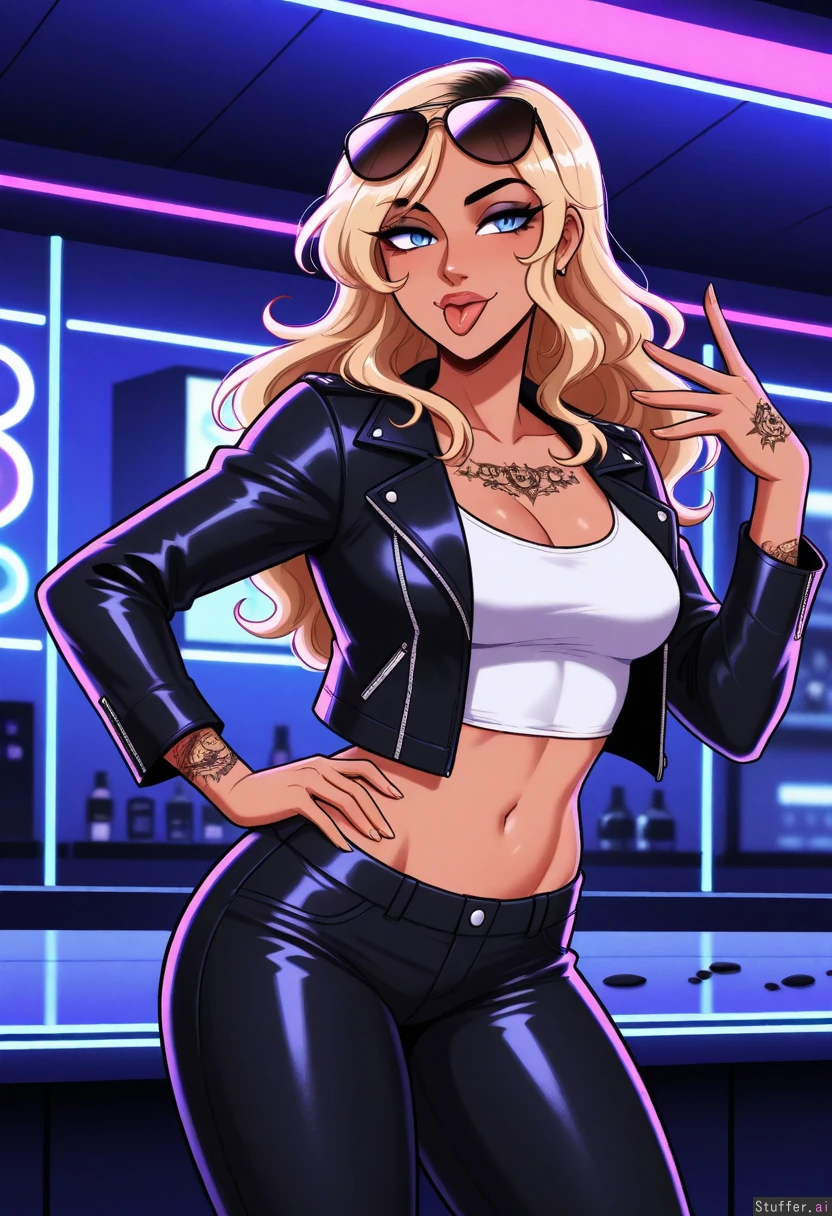 Solo, scruffyturtles(artist), perfect proportions, (supermodel face), sexy, ((realistic, detailed)), ((latina)) (Dyed blonde hair), ((black roots)) wavy hair ((blue eyes)), black eye liner, (black leather jacket), (white tank top crop top), (aviator sunglasses), (black jeans), (((tattoos))), (light tan skin) ((Soft body)), (medium breasts), ((soft hips)), ((soft thighs)) (In a nightclub bar), standing, (flirty), sexy pose, big lips, ((tongue out)), (rock hand sign)