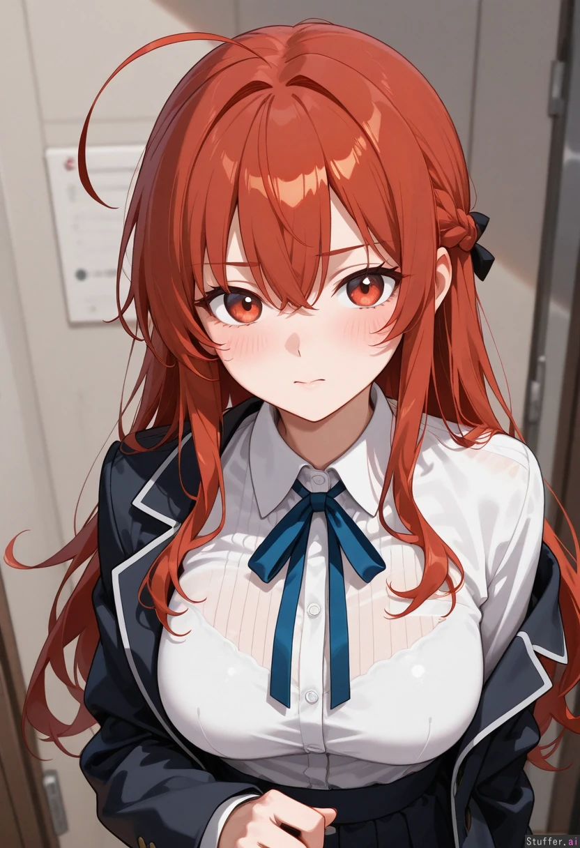 22-year-old man, Dragon hybrid human Hair: (Short black hair with blue streaks) Eyes: (Blue) Features: (Dragon hybrid human, tall, normal hands with black nails, grey horns, blue wings and long blue tail, curvy figure,Large, thick thighs, blue clawed feet,flat chest, huge belly Pregnant) Clothing: (a pink crop top, a black pleated skirt, black stockings that are ripped at the toes.)