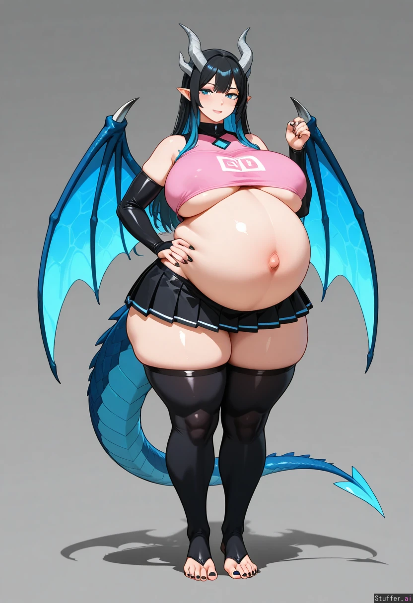 22-year-old man, Dragon hybrid human Hair: (Short black hair with blue streaks) Eyes: (Blue) Features: (Dragon hybrid human, tall, normal hands with black nails, grey horns, blue wings and long blue tail, curvy figure,Large, thick thighs, blue clawed feet, huge belly Pregnant) Clothing: (a pink crop top, a black pleated skirt, black stockings that are ripped at the toes.)