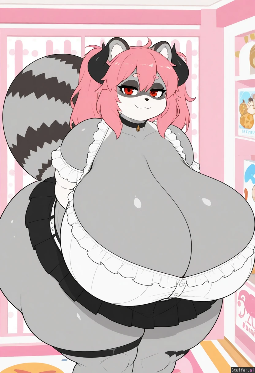 (simple style), (less detail), flat colors, color, top quality (Morbidly Obese), mega_thick_thighs:1.7 (mega_gigantic_ass:1.7), (inflated:1.7), (mega_gigantic_breasts:1.7) bedroom background, colorful room, messy, long eyelashes, smug:1.1 (1girl, anthro raccoon girl,raccoon ears, furry, grey fur, long hair, pink hair, twintail hair, highlights, raccoon tail, hyper breasts, ((gigantic_breasts:1.5)), extreme proportions, red eyes, exposed shoulders, succubus, succubus horns, fat thighs, fat_ass, chubby cropped_button_up_blouse, short skirt, pleated skirt, cleavage, cleavage_overflow:1.3, garters ourobot\(artist\)