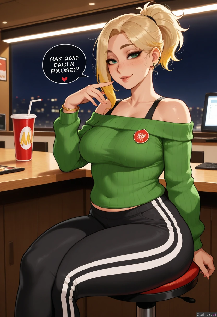 nyantcha:1.2), (krekkov:1.4), (reiq:1.1), (kittew:1.3), best quality, intricate details, hdr, detailed eyes, (soft shading), realistic, dim lighting, realistic lighting, 1woman, ((chubby alt mommy)), messy single ponytail on back of head straight_hair, sitting, teasing (sipping soda), looking at viewer, flirty, blonde hair with blonde highlighted tips, hazel green eyes, lots of freckles, her bangs are blonde, wide hips, thick thighs, medium breasts, (chubby belly:3.0), tummy pooch, legs crossed, happy, sweet, nave, flushed, ((fat:1.0)), chubby figure, fatass, Black and white striped off-shoulder sweater, sweater hanging over belly, dark black oversized baggy sweat pants, gold thin bracelets, small gold ear piercings, Fast food place, evening,