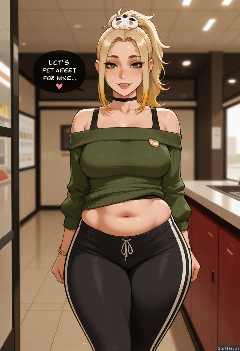 nyantcha:1.2), (krekkov:1.4), (reiq:1.1), (kittew:1.3), best quality, intricate details, hdr, detailed eyes, (soft shading), realistic, dim lighting, realistic lighting, 1woman, ((chubby alt mommy)), messy single ponytail on back of head straight_hair, standing, teasing (tilting head sideways), looking at viewer, flirty, blonde hair with blonde highlighted tips, hazel green eyes, lots of freckles, her bangs are blonde, wide hips, thick thighs, medium breasts, (skinny belly:3.0), tummy pooch, legs crossed, happy, sweet, nave, flushed, ((fit:1.0)), slim figure, fatass, Black and white striped off-shoulder sweater, sweater hanging over belly, dark black oversized baggy sweat pants, gold thin bracelets, small gold ear piercings, Fast food place, evening,