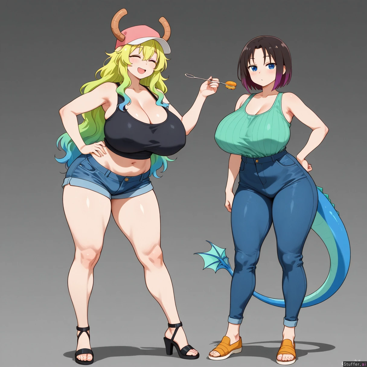 **character** elma_(maidragon), milf, lucoa_(maidragon) **artist** Bamboo_ale(artist) **clothes** Home_outfit, **settings** full_body, 2girls, Elma feeding lucoa **body** (Tall:1.2), long_legs ((Wide_hips), (hyper_fat_belly), (gigantic_breasts), (gigantic_belly), (gigantic_ass), (gigantic_thighs), (morbidly_obese_female), (love_handls), (bellyheavy) (Fat_arms), (fat_legs),:0.1),