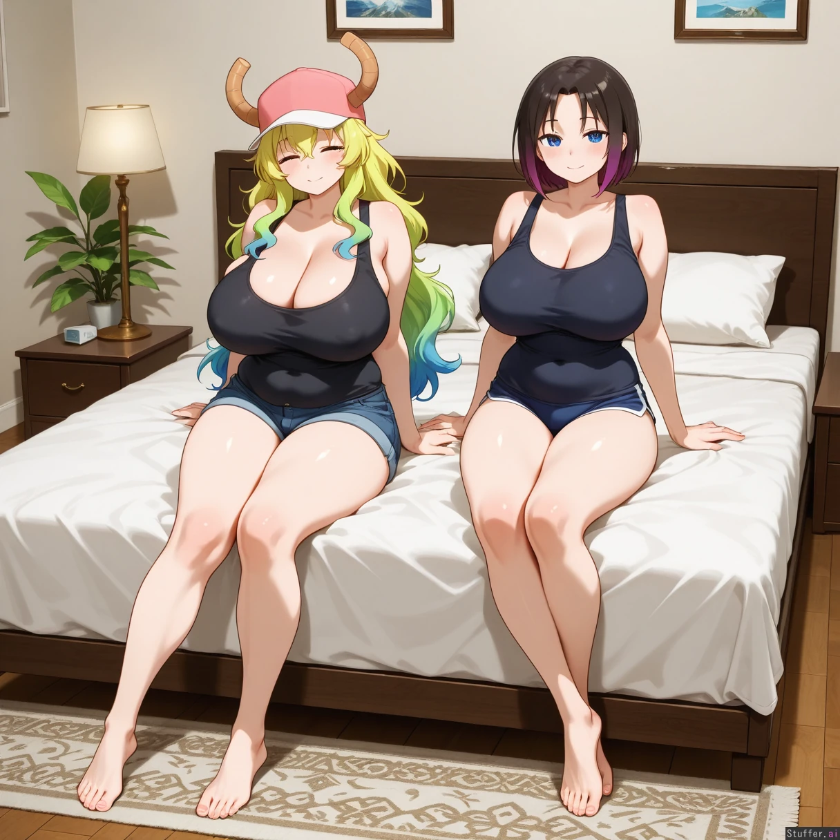 **character** elma_(maidragon), milf, lucoa_(maidragon) **artist** Bamboo_ale(artist) **clothes** Home_outfit, **settings** full_body, 2girls, living room, siting_on_bed **body** (Tall:1.2), long_legs ((Wide_hips), (hyper_fat_belly), (gigantic_breasts), (gigantic_belly), (gigantic_ass), (gigantic_thighs), (morbidly_obese_female), (love_handls), (bellyheavy) (Fat_arms), (fat_legs),:0.1),