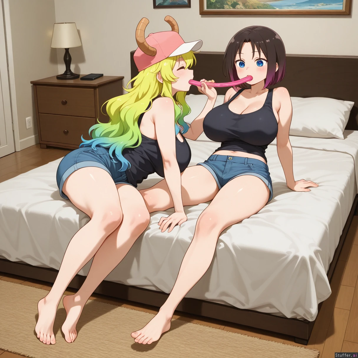 **character** elma_(maidragon), lucoa_(maidragon) **artist** Bamboo_ale(artist) **clothes** Home_outfit, **settings** full_body, 2girls, living room, siting_on_bed, force_feeding **body** (Tall:1.2), long_legs ((Wide_hips), (hyper_fat_belly), (gigantic_breasts), (gigantic_belly), (gigantic_ass), (gigantic_thighs), (morbidly_obese_female), (love_handls), (bellyheavy) (Fat_arms), (fat_legs),:0.1),