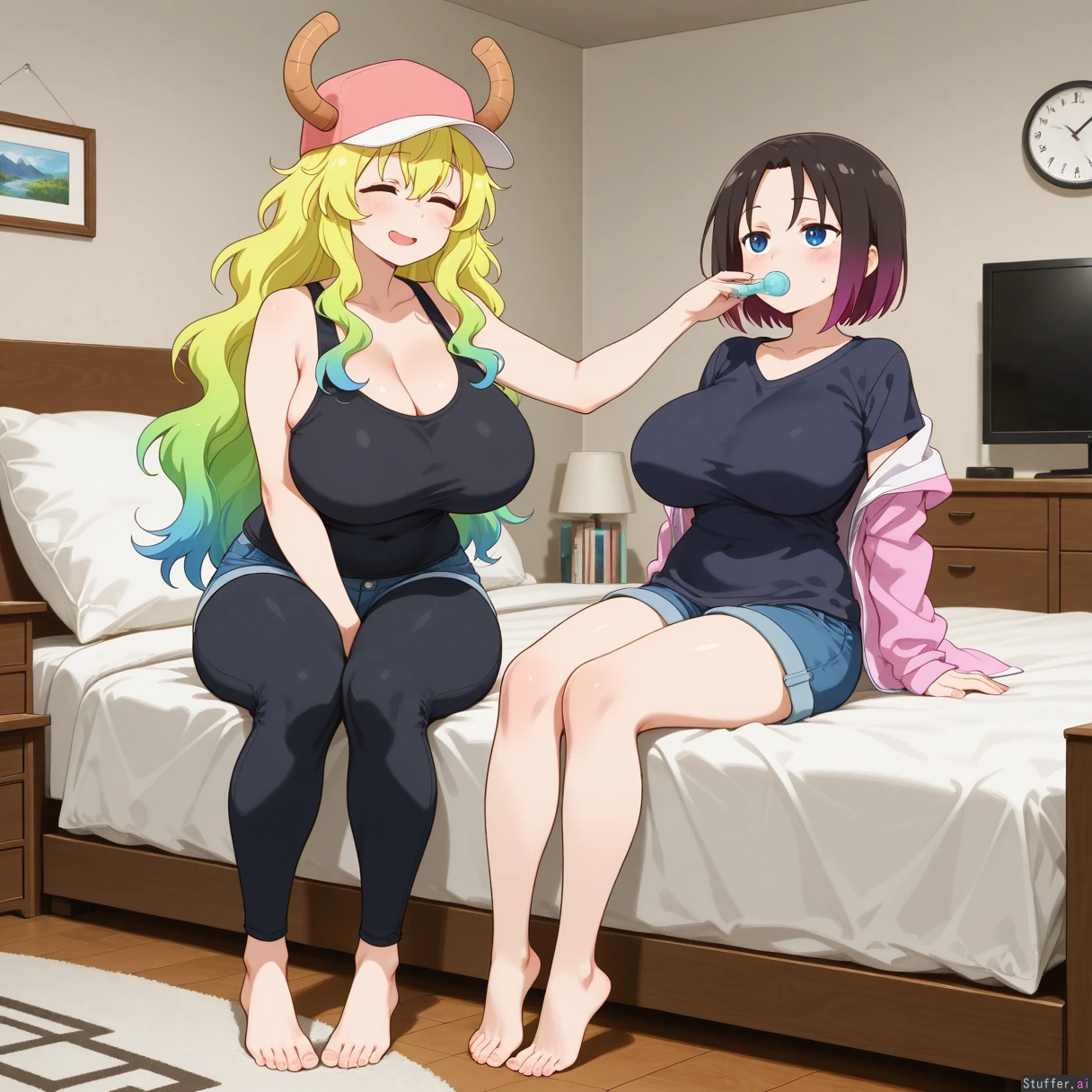 **character** elma_(maidragon), lucoa_(maidragon) **artist** Bamboo_ale(artist) **clothes** Home_outfit, **settings** full_body, 2girls, living room, siting_on_bed, force_feeding **body** (Tall:1.2), long_legs ((Wide_hips), (hyper_fat_belly), (gigantic_breasts), (gigantic_belly), (gigantic_ass), (gigantic_thighs), (morbidly_obese_female), (love_handls), (bellyheavy) (Fat_arms), (fat_legs),:0.1),