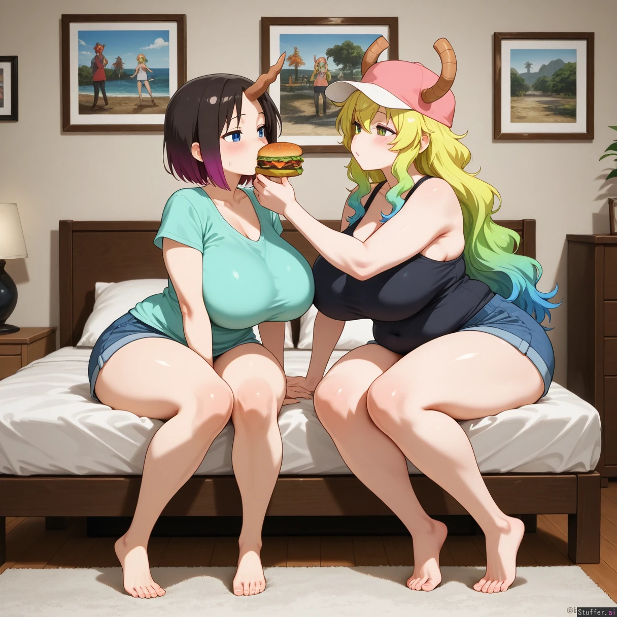 **character** elma_(maidragon), lucoa_(maidragon) **artist** Bamboo_ale(artist) **clothes** Home_outfit, **settings** full_body, 2girls, living room, siting_on_bed, force_feeding_burger **body** (Tall:1.2), long_legs ((Wide_hips), (hyper_fat_belly), (gigantic_breasts), (gigantic_belly), (gigantic_ass), (gigantic_thighs), (morbidly_obese_female), (love_handls), (bellyheavy) (Fat_arms), (fat_legs),:0.6),