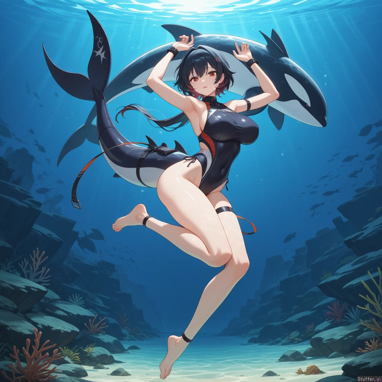 **character** Ellen_Joe(Zenless_Zone_Zero), orca_girl **artist** Bamboo_ale(artist) **clothes** Swimsuit **settings** full_body, 1girl, underwater **body** (Tall:1.2), long_legs ((Wide_hips), (hyper_fat_belly), (gigantic_breasts), (gigantic_belly), (gigantic_ass), (gigantic_thighs), (morbidly_obese_female), (love_handls), (bellyheavy) (Fat_arms), (fat_legs),:0.1),
