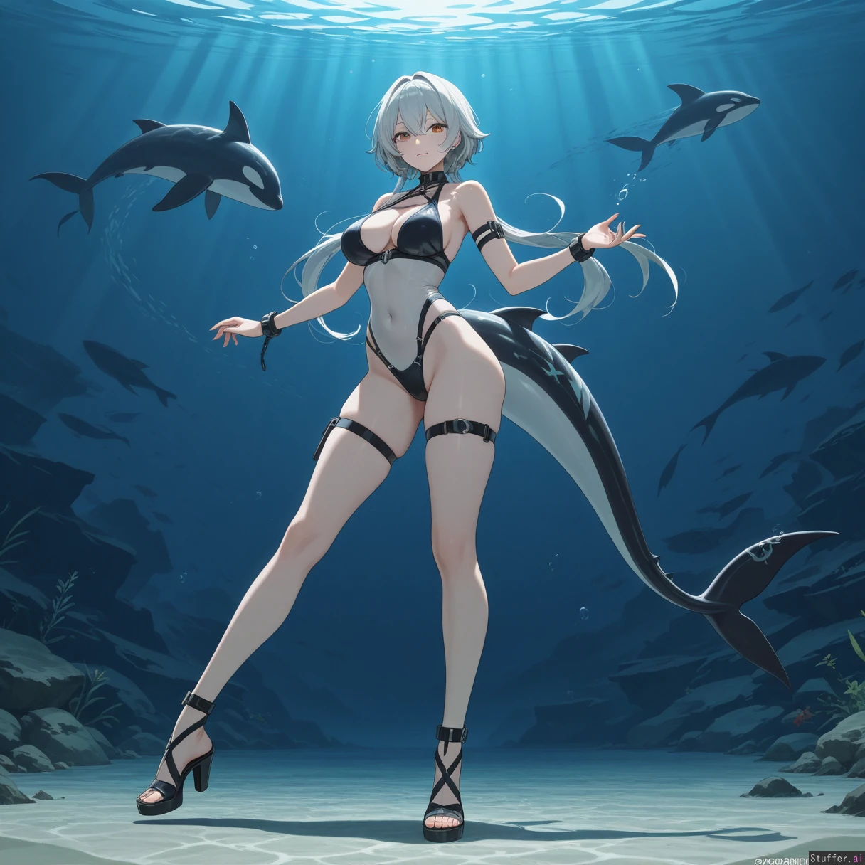 **character** Ellen_Joe(Zenless_Zone_Zero), orca_girl, milf **artist** Bamboo_ale(artist) **clothes** Swimsuit **settings** full_body, 1girl, underwater **body** (Tall:1.2), long_legs ((Wide_hips), (hyper_fat_belly), (gigantic_breasts), (gigantic_belly), (gigantic_ass), (gigantic_thighs), (morbidly_obese_female), (love_handls), (bellyheavy) (Fat_arms), (fat_legs),:0.1),