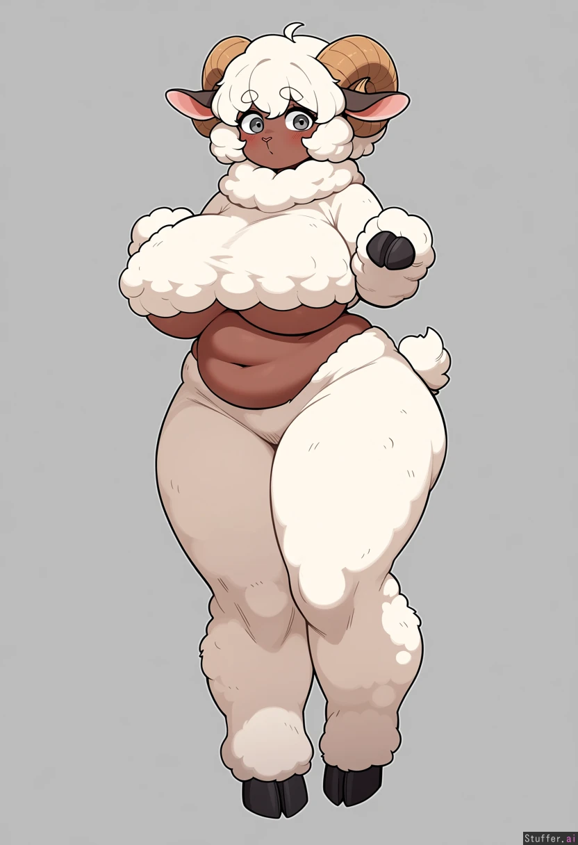 Height: 5'1" feet tall Face: fluffy short dirty white hair, ram horns, fluffy sheep ears, soft rosy cheeks, wide grey eyes Body: petite, pudgy stomach, fluffy dirty white wool coat, big breasts, stubby wooly sheep tail, digitigrade sheep legs with hooves, human hands Attire: naked besides fleece.