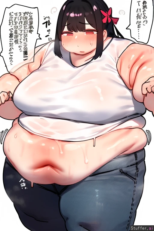 Pixiv, sketch, bambooale , C.cu, squarewave29, 1girl, Obese beauty with huge low hanging heavy saggy belly, beautiful, speech bubble, embarrassed, black hair, hair bows, wearing a white tshirt and jeans, saggy flabby belly, Unhealthy, sweaty, thick fat rolls, jiggling, stuffed full, heavy saggy belly, pudgy arms, flabby, heavy full lower belly,