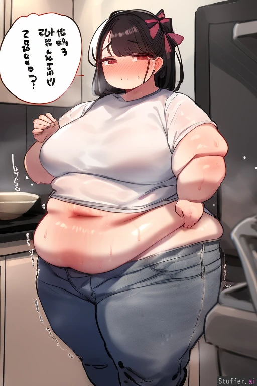 Pixiv, sketch, bambooale , C.cu, squarewave29, 1girl, Obese beauty with huge low hanging heavy saggy belly, beautiful, speech bubble, in the kitchen, embarrassed, black hair, hair bows, wearing a white tshirt and jeans, saggy flabby belly, Unhealthy, sweaty, thick fat rolls, jiggling, stuffed full, heavy saggy belly, pudgy arms, flabby, heavy full lower belly,