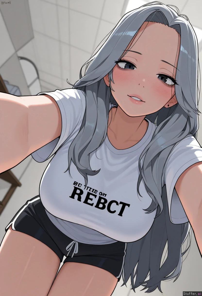 1girl, uhd, high resolution, flawless, best_quality, (hdr), (lineless:1.4), perfect anatomy, beautiful face, beautiful eyes, Tweedabop(artist), (ohasi_art), (betterwithsalt), w-oo-t(artist) Loose T-shirt, gym shorts, bleached grey hair, black hair roots, heavy makeup, thick lashes, heavy blush, wide lips, parted bangs, straight messy hair (eyes half open), freckles Bed, lying forward, close up