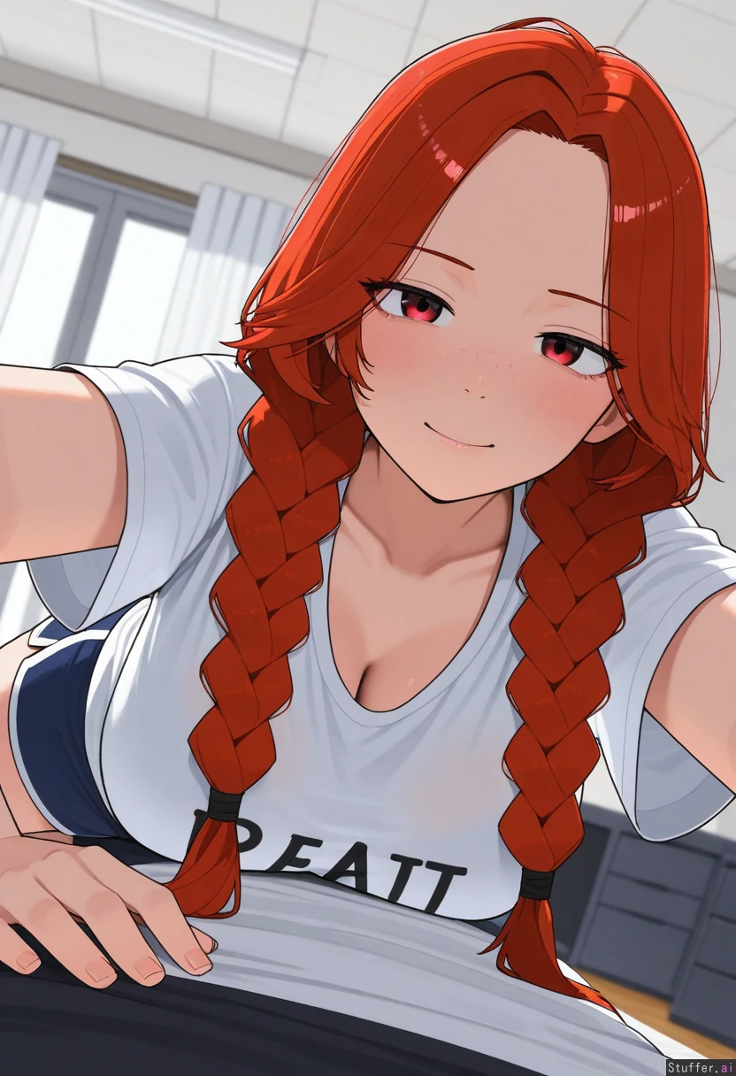 1girl, uhd, high resolution, flawless, best_quality, (hdr), (lineless:1.4), perfect anatomy, beautiful face, beautiful eyes, Tweedabop(artist), (ohasi_art), (betterwithsalt), w-oo-t(artist) Loose T-shirt, gym shorts, bleached_hair, black_roots, parted bangs, straight messy hair, braids (eyes half open), freckles Bed, lying forward, close up,