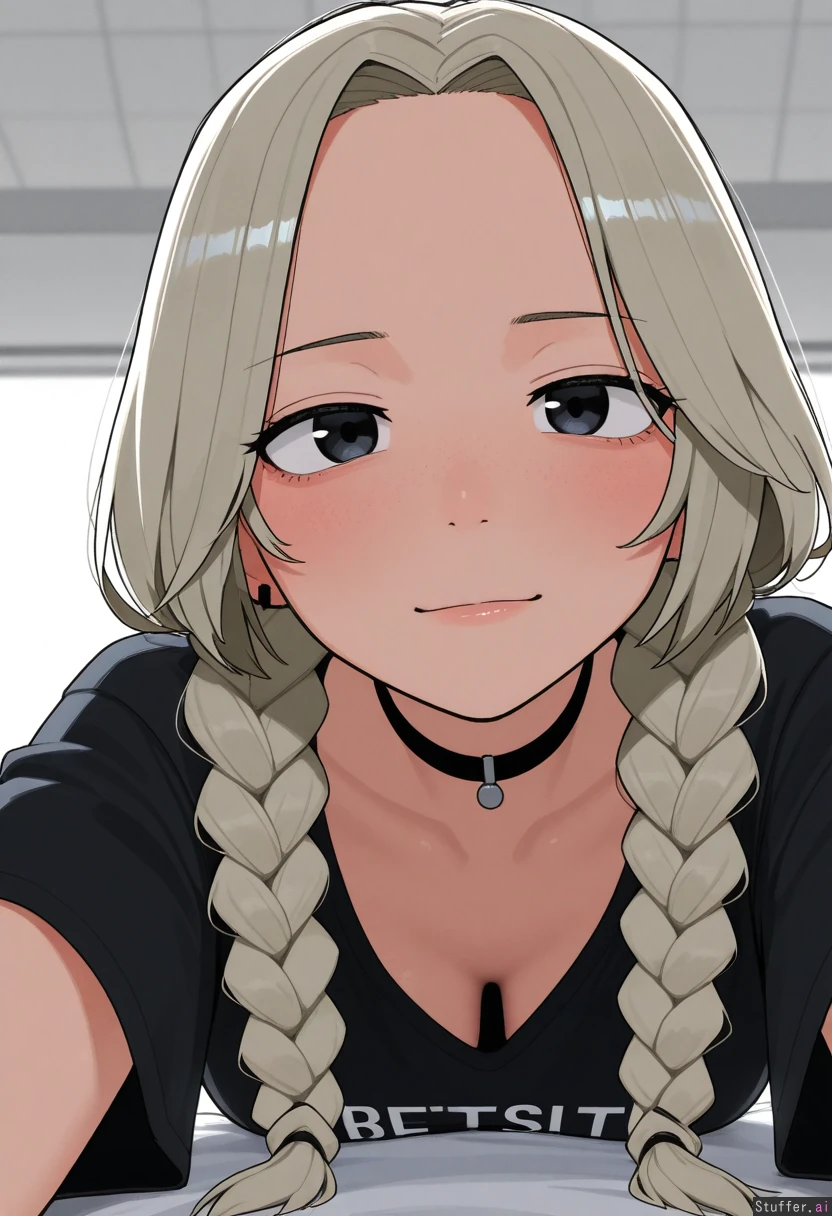 1girl, uhd, high resolution, flawless, best_quality, (hdr), (lineless:1.4), perfect anatomy, beautiful face, beautiful eyes, Tweedabop(artist), (ohasi_art), (betterwithsalt), w-oo-t(artist) Black Loose T-shirt, gym shorts, choker, light_blonde_grey_hair, black_roots, parted bangs, straight messy hair, thin short braids (eyes half open), freckles Bed, lying forward, close up,
