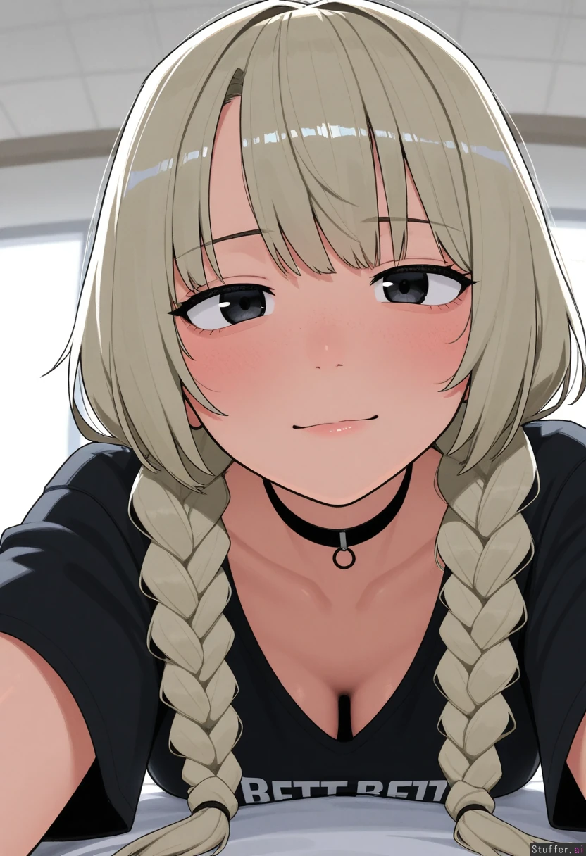 1girl, uhd, high resolution, flawless, best_quality, (hdr), (lineless:1.4), perfect anatomy, beautiful face, beautiful eyes, Tweedabop(artist), (ohasi_art), (betterwithsalt), w-oo-t(artist) Black Loose T-shirt, gym shorts, choker, light_blonde_grey_hair, black_roots, bangs, straight messy hair, thin short braids (eyes half open), freckles Bed, lying forward, close up, side_view