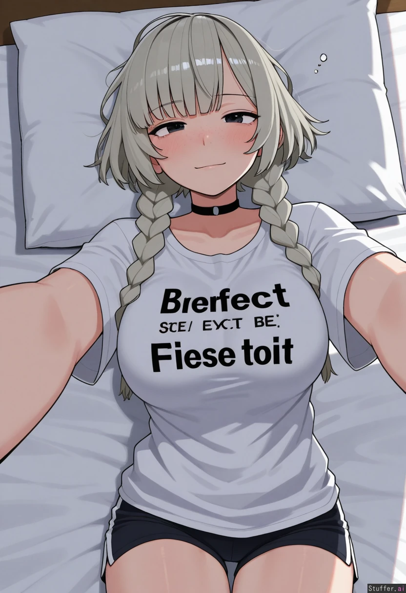 1girl, uhd, high resolution, flawless, best_quality, (hdr), (lineless:1.4), perfect anatomy, beautiful face, beautiful eyes, Tweedabop(artist), (ohasi_art), (betterwithsalt), w-oo-t(artist) Black_loose_T-shirt, gym shorts, choker, light_blonde_grey_hair, black_hair_roots, side bangs, straight messy hair, thin short braids (eyes half open), freckles Bed, lying forward, side_view