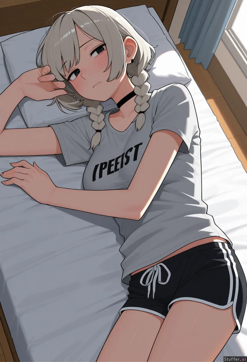 1girl, uhd, high resolution, flawless, best_quality, (hdr), (lineless:1.4), perfect anatomy, beautiful face, beautiful eyes, Tweedabop(artist), (ohasi_art), (betterwithsalt), w-oo-t(artist) black_loose_T-shirt, gym shorts, choker, light_blonde_grey_hair, black_hair_roots, swept_bangs, straight messy hair, thin short braids (eyes half open), freckles Bed, lying forward, side_view