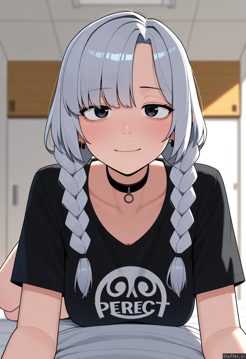 1girl, uhd, high resolution, flawless, best_quality, (hdr), (lineless:1.4), perfect anatomy, beautiful face, beautiful eyes, Tweedabop(artist), (ohasi_art), (betterwithsalt), w-oo-t(artist) Huge_loose_T-shirt, black_shirt, gym shorts, choker, light_blonde_grey_hair, black_to_grey_hair_gradient, side_parted_bangs, emo_hair, thin hair, thin short braids (eyes half open), freckles Bed, lying forward, side_view