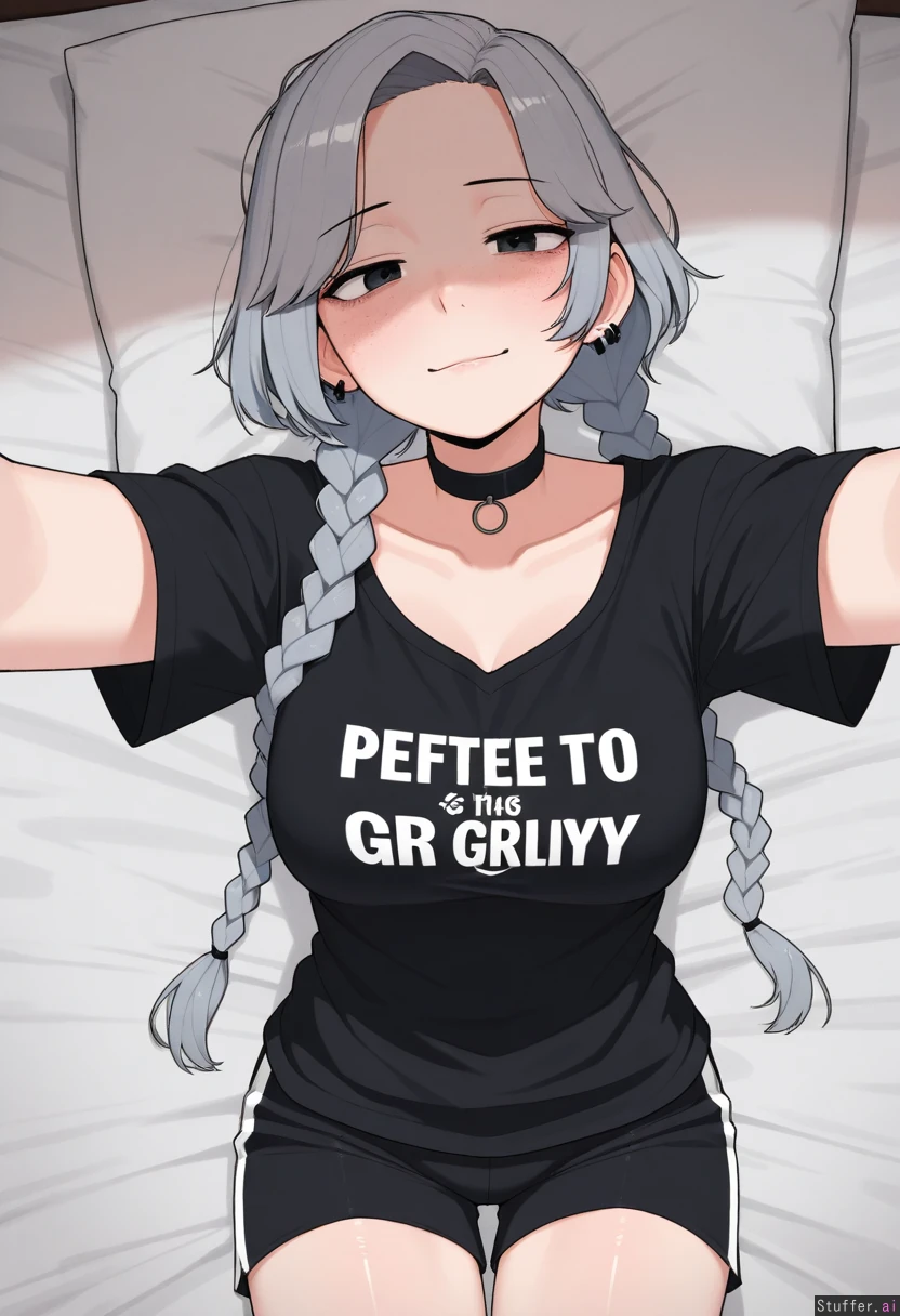 1girl, uhd, high resolution, flawless, best_quality, (hdr), (lineless:1.4), perfect anatomy, beautiful face, beautiful eyes, Tweedabop(artist), (ohasi_art), (betterwithsalt), w-oo-t(artist) Huge_loose_T-shirt, black_shirt, gym shorts, choker, ((black_to_grey_hair_gradient)), side_parted_bangs, emo_hair, thin hair, thin short braids (eyes half open), freckles Bed, lying forward, side_view