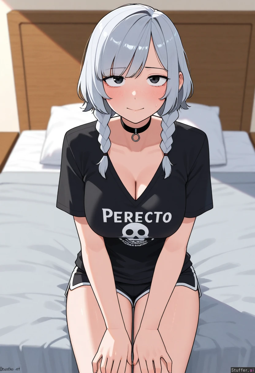 1girl, uhd, high resolution, flawless, best_quality, (hdr), (lineless:1.4), perfect anatomy, beautiful face, beautiful eyes, Tweedabop(artist), (ohasi_art), (betterwithsalt), w-oo-t(artist) Huge_loose_T-shirt, v_neck, black_shirt, gym shorts, choker, ((black_to_grey_hair_gradient, side_swept_bangs, emo_hair)), thin hair, thin short braids (eyes half open), freckles Bed, side_view