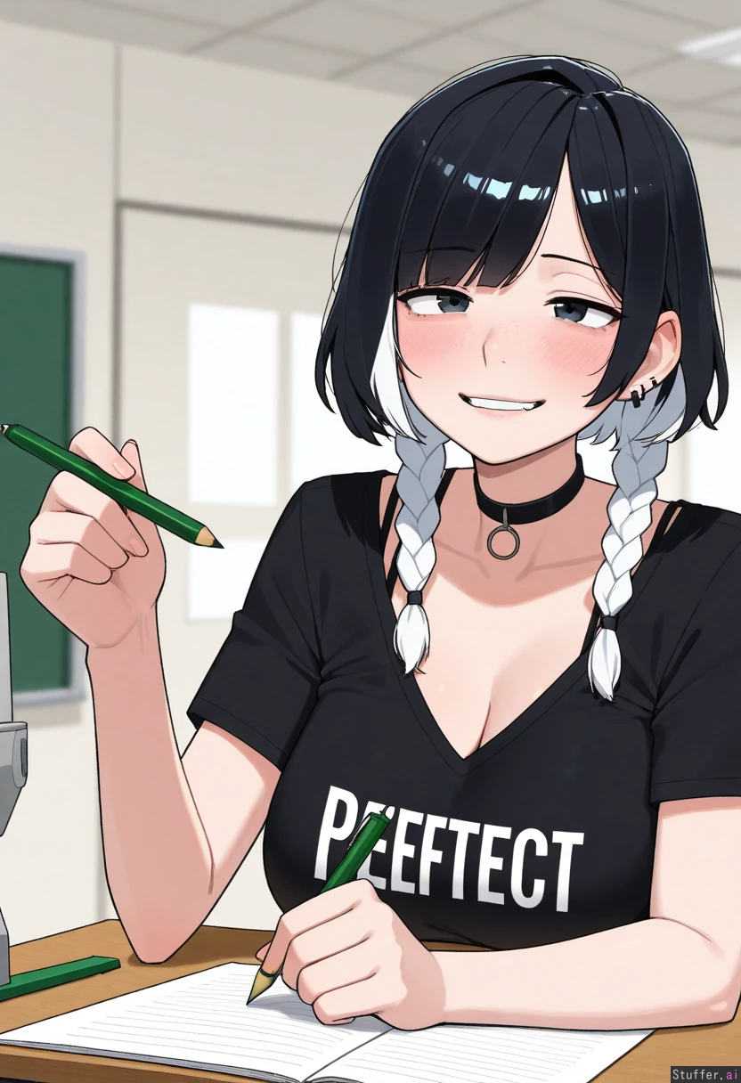 1girl, uhd, high resolution, flawless, best_quality, (hdr), (lineless:1.4), perfect anatomy, beautiful face, beautiful eyes, Tweedabop(artist), (ohasi_art), (betterwithsalt), w-oo-t(artist) Huge_loose_T-shirt, v_neck, bra_straps, black_shirt, gym shorts, choker, ((white_hair, black_hair_roots, side_swept_hair, emo)), thin hair, thin short braids, Overweight (eyes half open), wide smile, ((freckles)), horny, blushing, (((holding_pencil, biting_pencil))) (((Desk, side_view, full_body)))