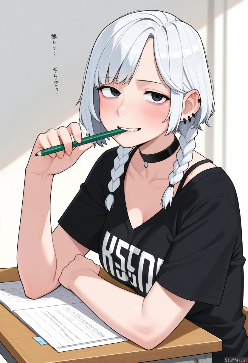 1girl, uhd, high resolution, flawless, best_quality, (hdr), (lineless:1.4), perfect anatomy, beautiful face, beautiful eyes, Tweedabop(artist), (ohasi_art), (betterwithsalt), w-oo-t(artist) Huge_loose_T-shirt, v_neck, bra_straps, black_shirt, gym shorts, choker, ((white_hair_black_hair_gradient, side_swept_hair, emo)), thin hair, thin short braids, Overweight (eyes half open), wide smile, ((freckles)), horny, blushing, (((holding_pencil, biting_pencil))) (((Desk, side_view, full_body)))