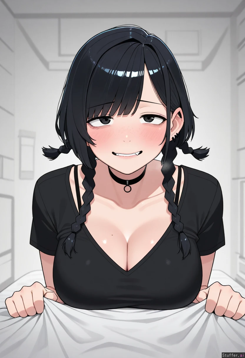 1girl, uhd, high resolution, flawless, best_quality, (hdr), (lineless:1.4), perfect anatomy, beautiful face, beautiful eyes, Tweedabop(artist), (ohasi_art), (betterwithsalt), w-oo-t(artist) Huge_loose_T-shirt, v_neck, bra_straps, black_shirt, gym shorts, choker, ((black_white_hair_gradient, side_swept_hair, emo)), thin hair, thin short braids, Overweight, thick, chubby (eyes half open), wide smile, ((freckles)),steamy, heavy breathing, horny, blushing, looking at viewer, (((biting_pencil))) (((Bed, full_body, view_from_side)))