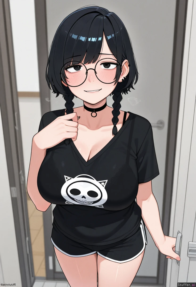 1girl, uhd, high resolution, flawless, best_quality, (hdr), (lineless:1.4), perfect anatomy, beautiful face, beautiful eyes, Tweedabop(artist), (ohasi_art), (betterwithsalt), w-oo-t(artist) Huge_loose_T-shirt, v_neck, bra_straps, black_shirt, gym shorts, choker, ((black_white_hair_gradient, side_swept_hair, emo)), thin hair, thin short braids, Overweight, thick, chubby (eyes half open), wide smile, ((freckles)),steamy, heavy breathing, horny, blushing, looking at viewer, (((biting lip))), glasses (((Standing, view_from_side)))