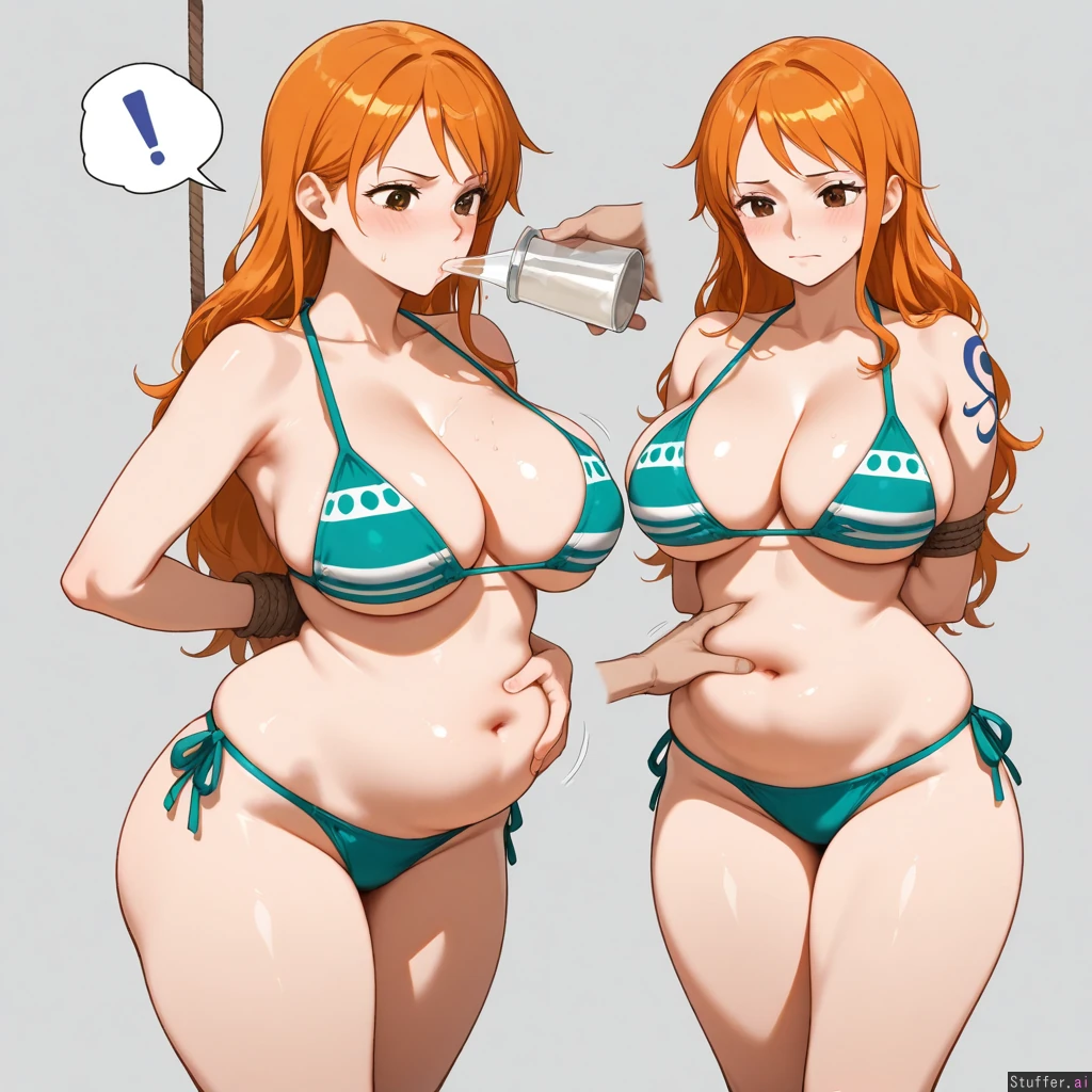 masterpiece, best quality, score_7. 1girl, one girl, Nami from One Piece, orange hair, chugging milk, messy, small tight potbelly, cleavage, bikini, thick thighs, groping belly, hands on belly, belly rub, funnel feed, tied up with rope, hands behind back