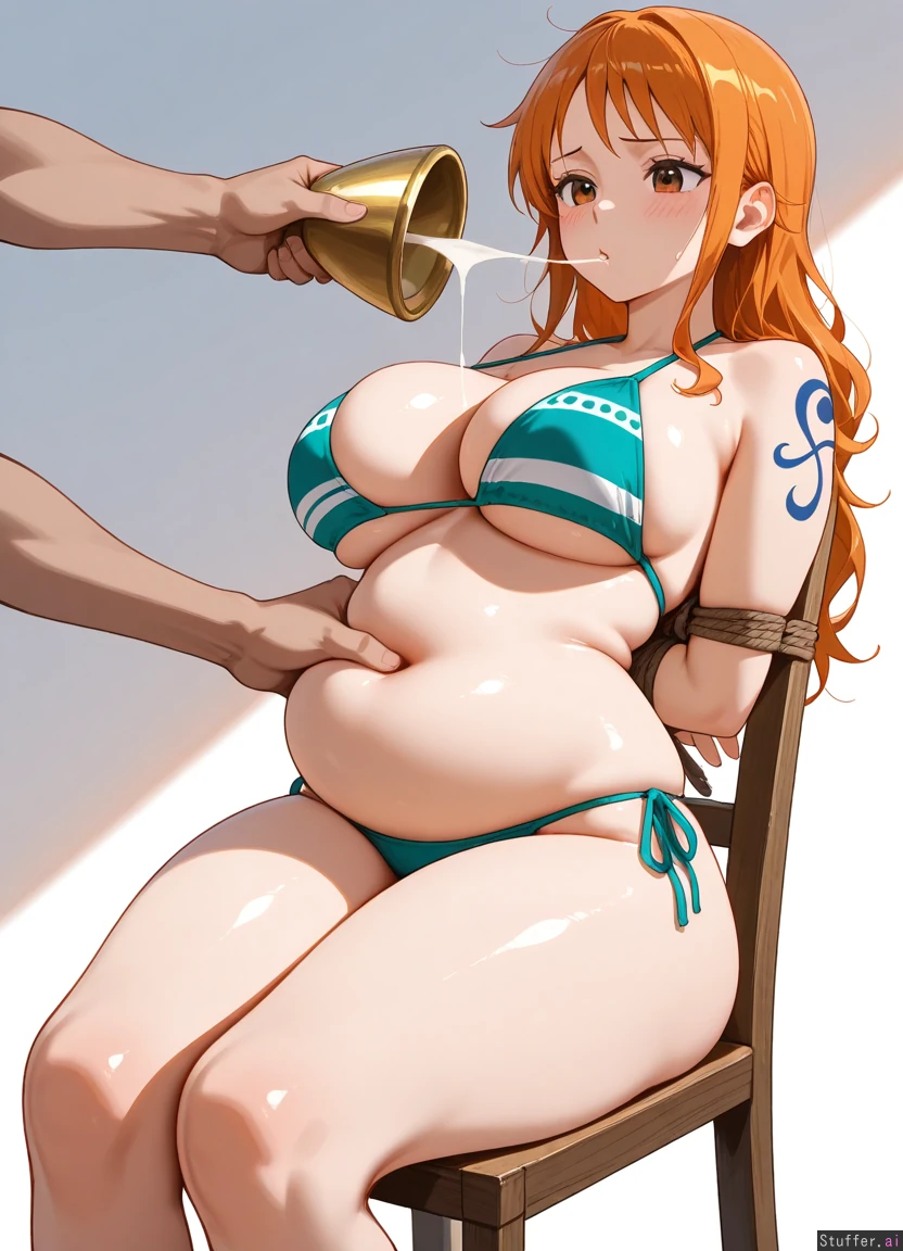 masterpiece, best quality, score_7. 1girl, one girl, Nami from One Piece, orange hair, chugging milk, messy, small tight potbelly, cleavage, bikini, thick thighs, groping belly, hands on belly, belly rub, funnel feed, tied up with rope, hands behind back, sitting on a chair