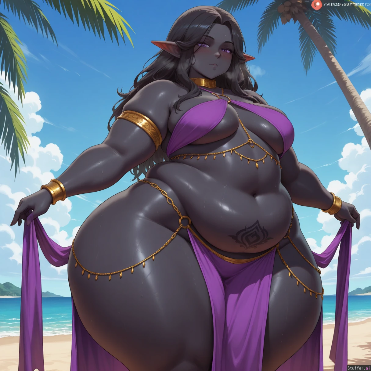 best quality), (high rating), absurd res, high res, detailed, ultra quality, (high quality), masterpiece, stunning beauty, (((detailed face))), intricate detail, beautiful face, exquisite detail, absurd resolution, correct anatomy, 8k, high definition picture, (highly detailed face), highly detailed skin texture, detailed background, (((perfect human anatomy))), ((perfect proportions)), Coffeeslice, shexyo, cutesexyrobutts, **Character:** 1girl. Solo. Feedee, elf, (((milf))), **Body Appearance:** ((wide hips:1.8)), medium breasts, ((bottomheavy)), (love handles), ((obese:1.0)), ((bulky limbs)), ((thick thighs:1.5)), ((fat arms:1.4)), ((obese legs:1.45)), ((black skin:1.5)), ((round chubby face:1.5))), ((fat legs:1.6)), cellulite, hip dips, fat rolls, **Eye:** purple eyes. **Emotions:** blush, ((horny)), sweaty, submissive, *Hair/Styles:** long hair, black hair, messy, **Clothes:** belly dancer, belly tattoo **Setting:** ((((night)))), beach, **Actions:** (standing), sexual pose, looking at viewer, weight gain, heavy breathing, **Perspective::** ((from side)), close to viewer,