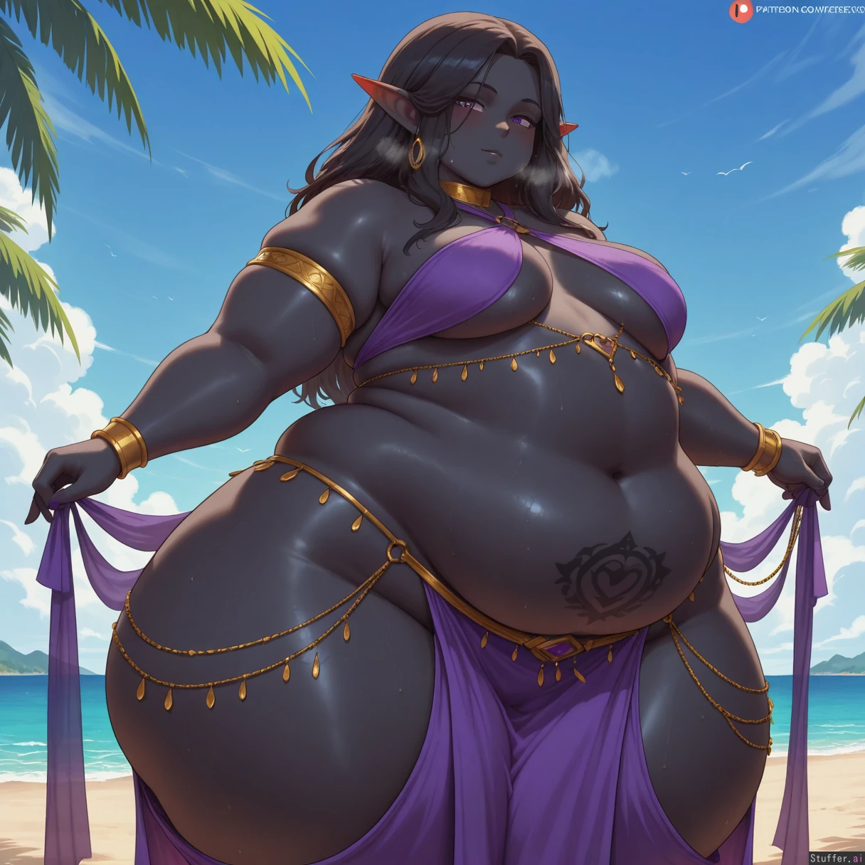 best quality), (high rating), absurd res, high res, detailed, ultra quality, (high quality), masterpiece, stunning beauty, (((detailed face))), intricate detail, beautiful face, exquisite detail, absurd resolution, correct anatomy, 8k, high definition picture, (highly detailed face), highly detailed skin texture, detailed background, (((perfect human anatomy))), ((perfect proportions)), Coffeeslice, shexyo, cutesexyrobutts, **Character:** 1girl. Solo. Feedee, elf, (((milf))), **Body Appearance:** ((wide hips:1.8)), medium breasts, ((bottomheavy)), (love handles), ((obese:1.6)), ((bulky limbs)), ((thick thighs:1.5)), ((fat arms:1.4)), ((obese legs:1.45)), ((black skin:1.5)), ((round chubby face:1.5))), ((fat legs:1.6)), cellulite, hip dips, fat rolls, **Eye:** purple eyes. **Emotions:** blush, ((horny)), sweaty, submissive, *Hair/Styles:** long hair, black hair, messy, **Clothes:** belly dancer, belly tattoo **Setting:** ((((night)))), beach, **Actions:** (standing), sexual pose, looking at viewer, weight gain, heavy breathing, **Perspective::** ((from side)), close to viewer,